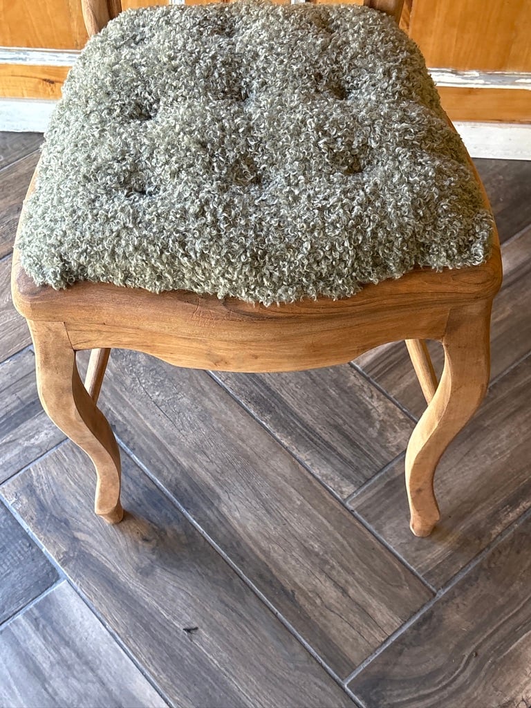 Assise refaite avec un tissu bouclette texturé dans une teinte vert sauge/grisé, douce et chaleureuse, apportant un contraste subtil avec le bois naturel.